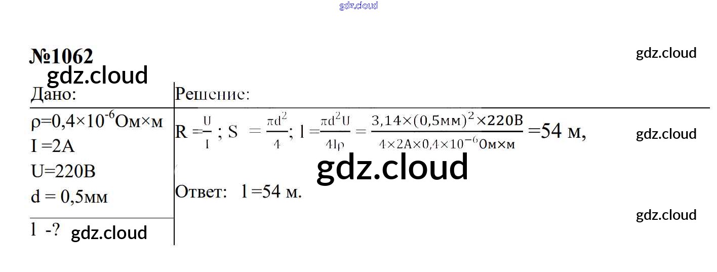 Ответ на задание 1062 Сборник задач Физика за 7, 8, 9 (седьмой, восьмой, девятый) класс Перышкин, Лонцова УМК 2016