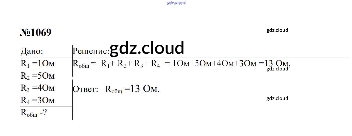 Ответ на задание 1069 Сборник задач Физика за 7, 8, 9 (седьмой, восьмой, девятый) класс Перышкин, Лонцова УМК 2016