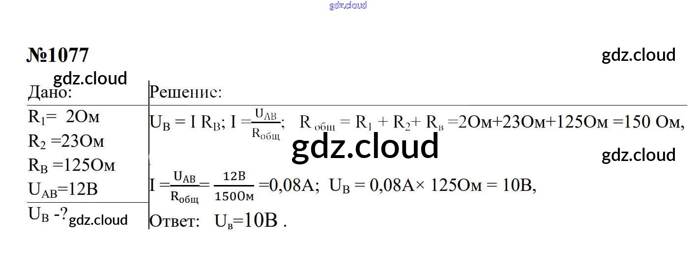 Ответ на задание 1077 Сборник задач Физика за 7, 8, 9 (седьмой, восьмой, девятый) класс Перышкин, Лонцова УМК 2016