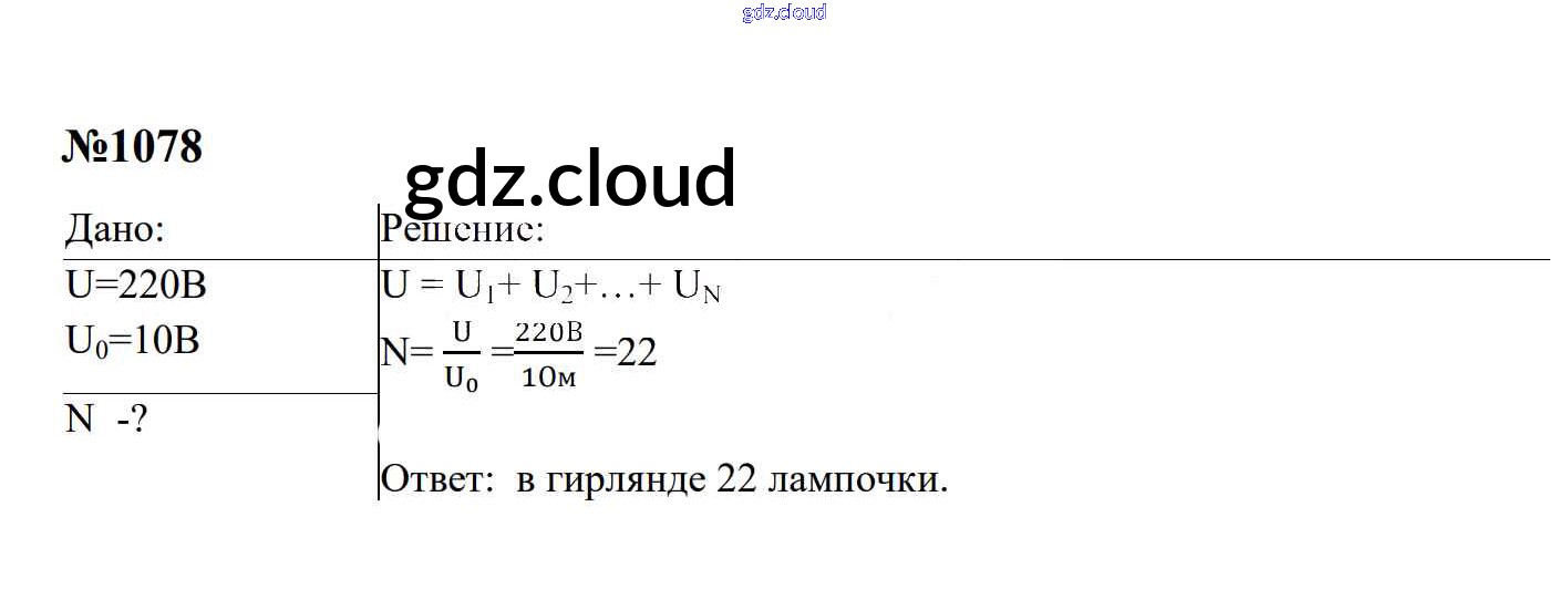 Ответ на задание 1078 Сборник задач Физика за 7, 8, 9 (седьмой, восьмой, девятый) класс Перышкин, Лонцова УМК 2016