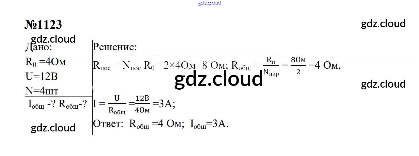 Ответ на задание 1123 Сборник задач Физика за 7, 8, 9 (седьмой, восьмой, девятый) класс Перышкин, Лонцова УМК 2016