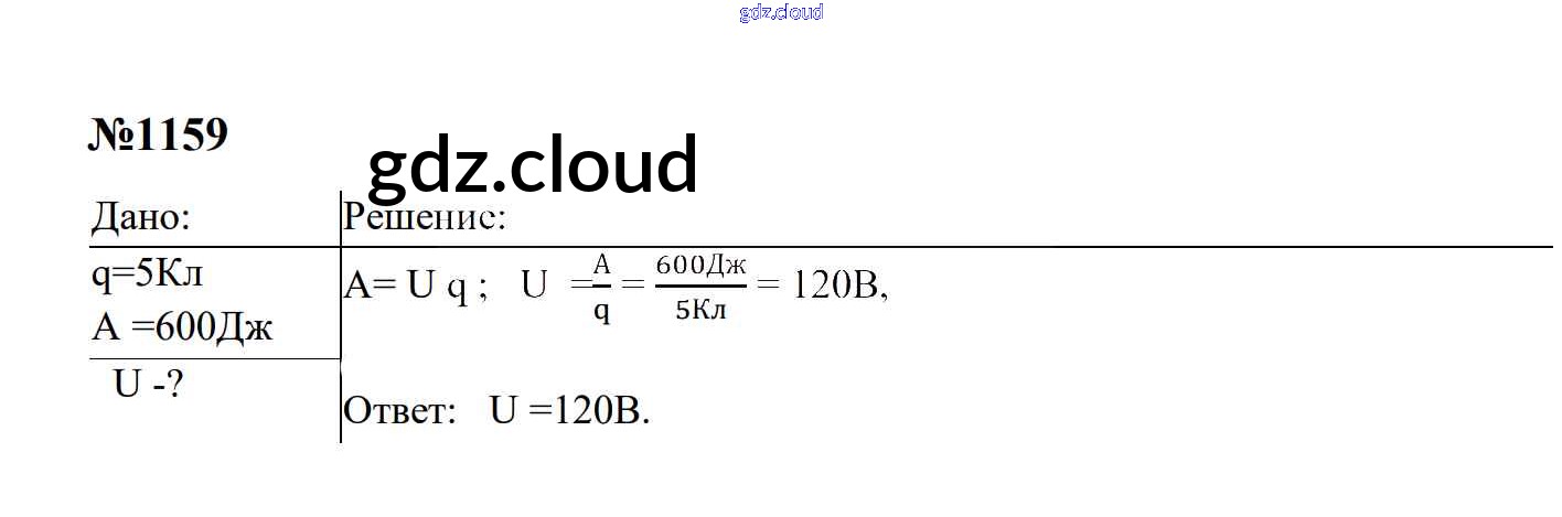 Ответ на задание 1159 Сборник задач Физика за 7, 8, 9 (седьмой, восьмой, девятый) класс Перышкин, Лонцова УМК 2016