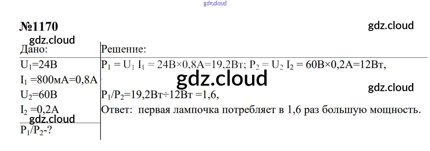 Ответ на задание 1170 Сборник задач Физика за 7, 8, 9 (седьмой, восьмой, девятый) класс Перышкин, Лонцова УМК 2016