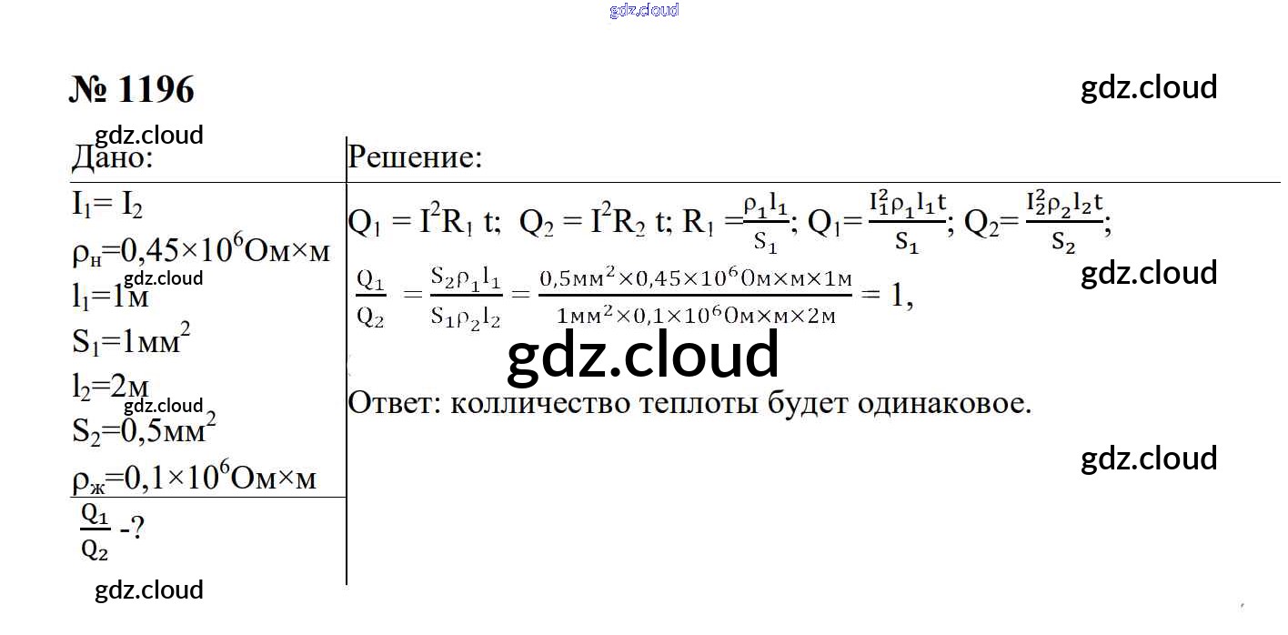 Ответ на задание 1196 Сборник задач Физика за 7, 8, 9 (седьмой, восьмой, девятый) класс Перышкин, Лонцова УМК 2016