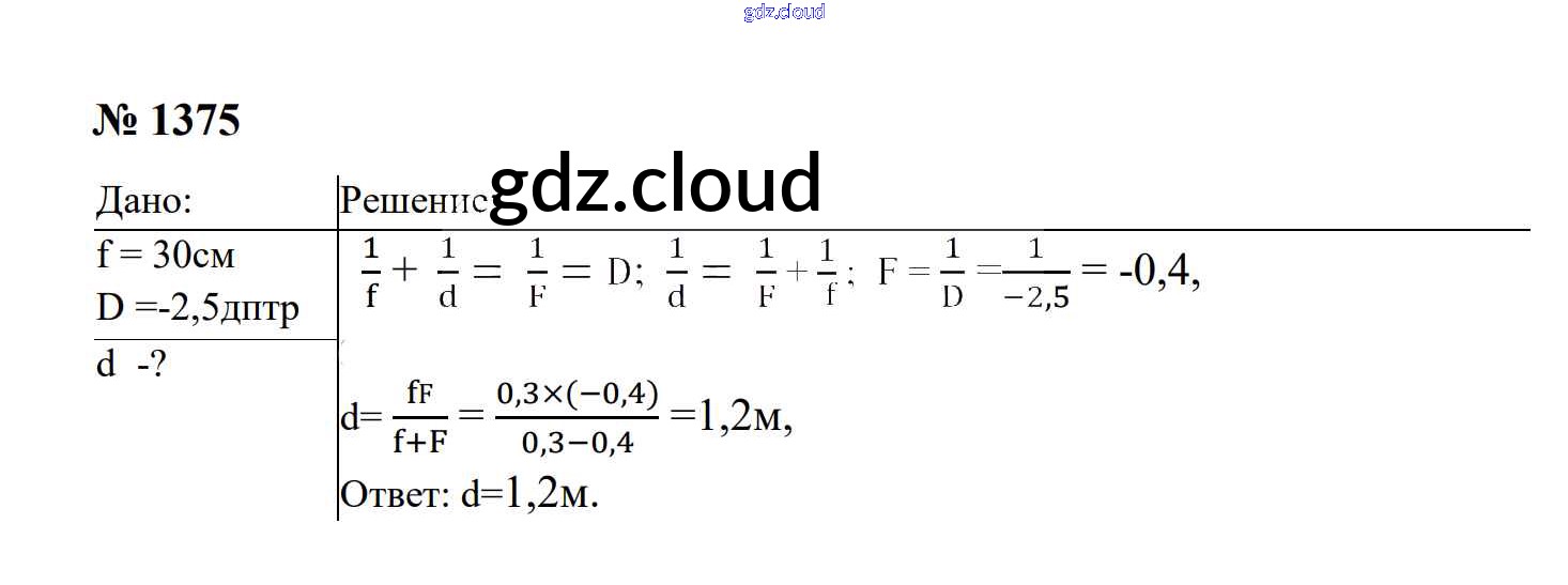 Ответ на задание 1375 Сборник задач Физика за 7, 8, 9 (седьмой, восьмой, девятый) класс Перышкин, Лонцова УМК 2016