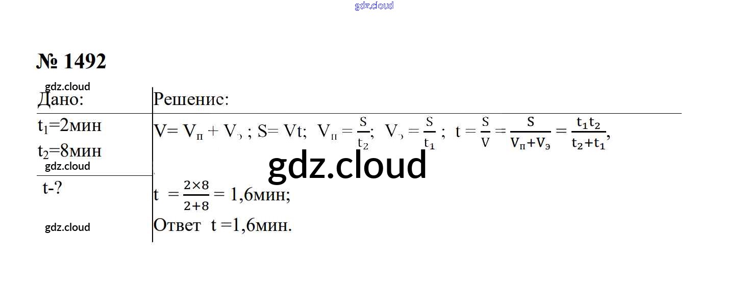 Ответ на задание 1492 Сборник задач Физика за 7, 8, 9 (седьмой, восьмой, девятый) класс Перышкин, Лонцова УМК 2016
