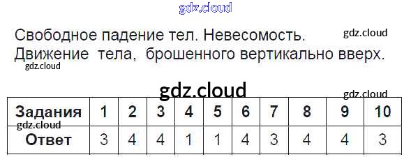 Ответ на задание Свободное падение тел. Движение тела, брошенного вертикально вверх. Невесомость Тесты Физика за 9 (девятый) класс Громцева УМК 2017