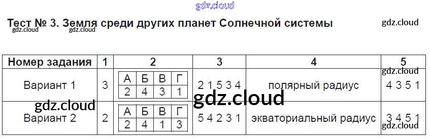 Ответы. Земля как планета солнечной системы по Географии 5 класс Тесты Пятунин УМК Экзамен