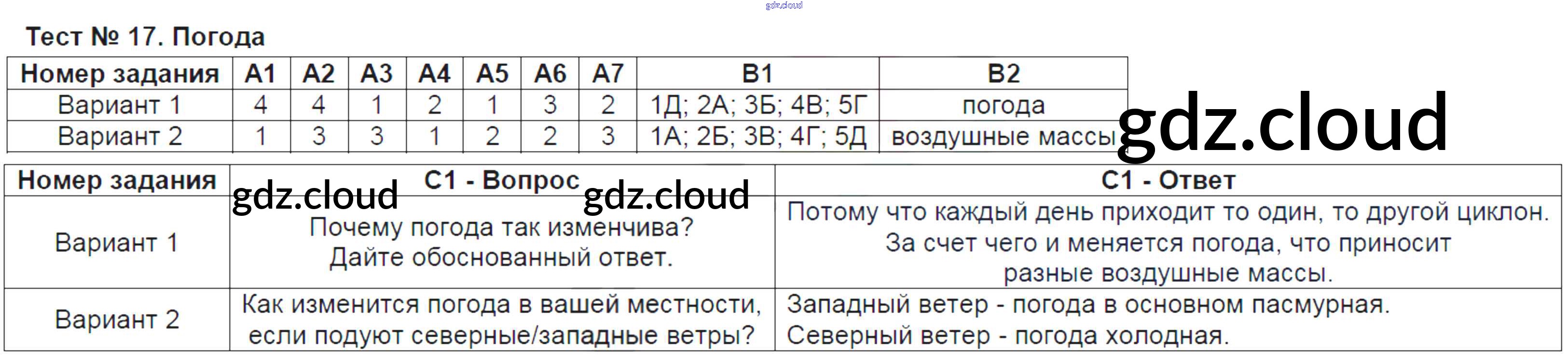 Ответ на задание Тест-17. Погода Контрольно-измерительные материалы (КИМ) География за 6 (шестой) класс Жижина 2018