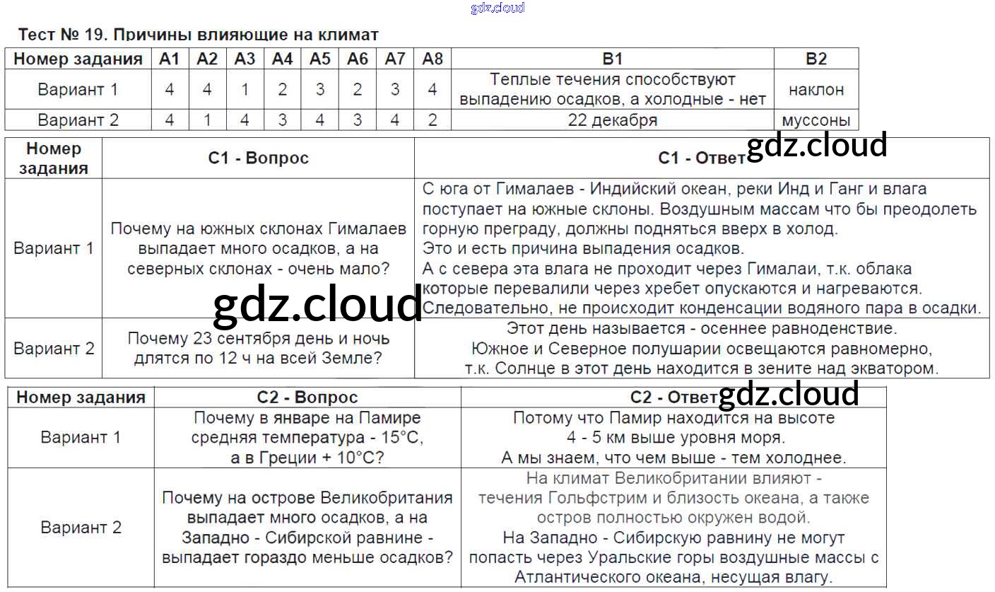 Ответ на задание Тест-19. Причины влияющие на климат Контрольно-измерительные материалы (КИМ) География за 6 (шестой) класс Жижина 2018