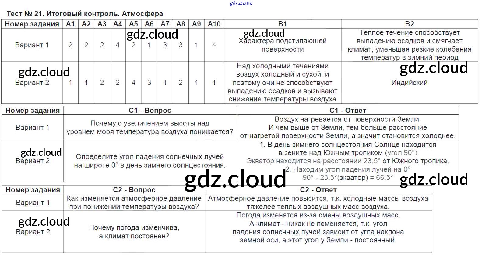 Ответ на задание Тест-21. Итоговый контроль. Атмосфера Контрольно-измерительные материалы (КИМ) География за 6 (шестой) класс Жижина 2018