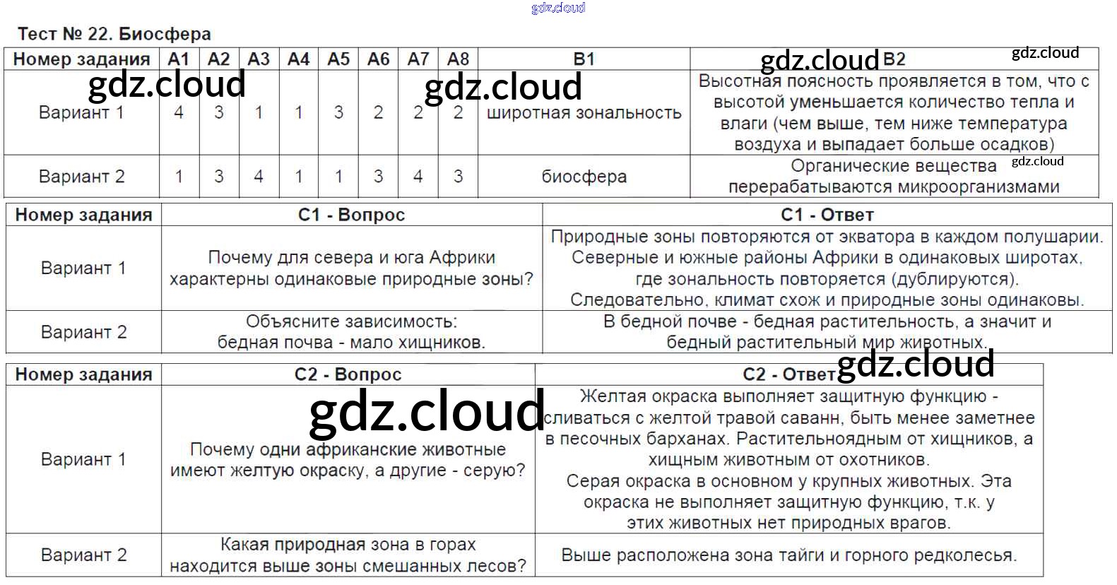 Ответ на задание Тест-22. Биосфера Контрольно-измерительные материалы (КИМ) География за 6 (шестой) класс Жижина 2018