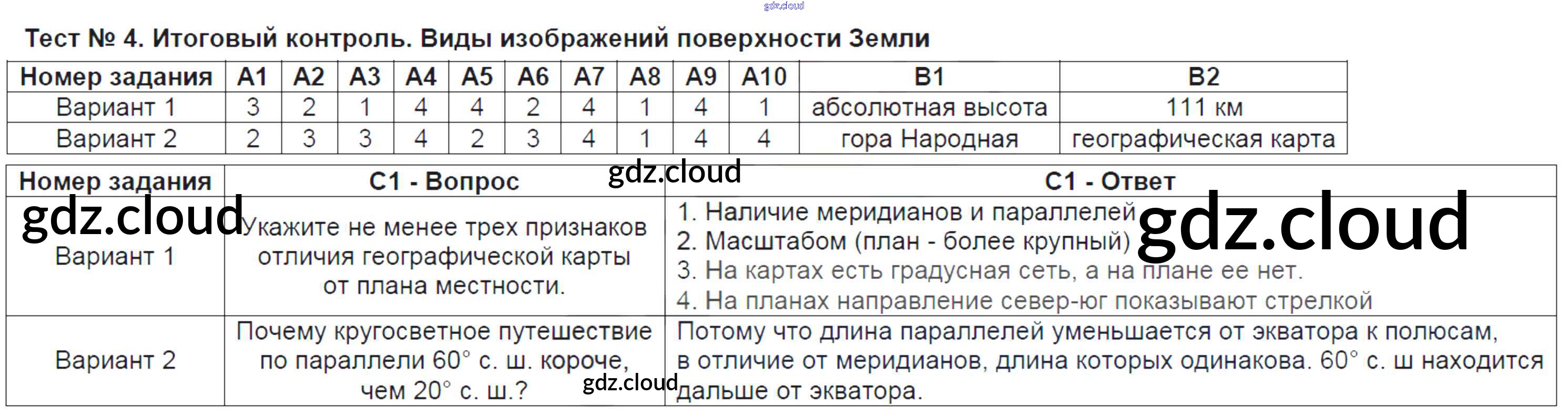 Ответ на задание Тест-4. Итоговый контроль. Виды изображений поверхности Земли Контрольно-измерительные материалы (КИМ) География за 6 (шестой) класс Жижина 2018