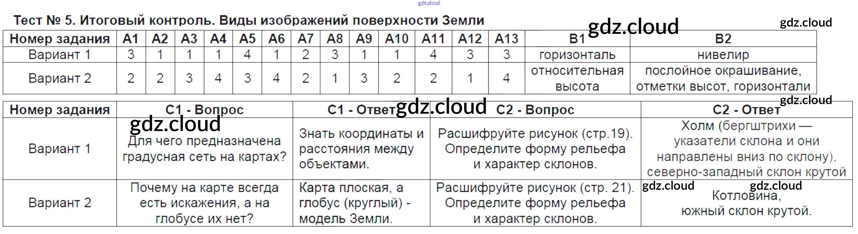 Ответ на задание Тест-5. Итоговый контроль. Виды изображений поверхности Земли Контрольно-измерительные материалы (КИМ) География за 6 (шестой) класс Жижина 2018