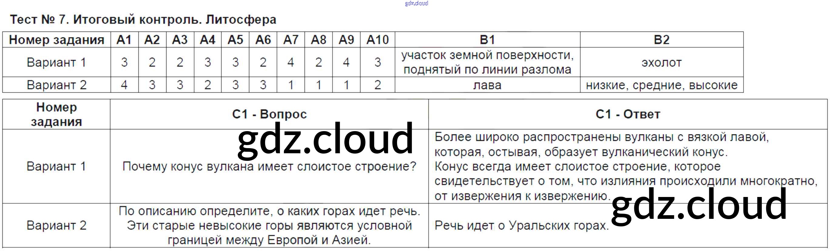 Ответ на задание Тест-7. Итоговый контроль. Литосфера Контрольно-измерительные материалы (КИМ) География за 6 (шестой) класс Жижина 2018
