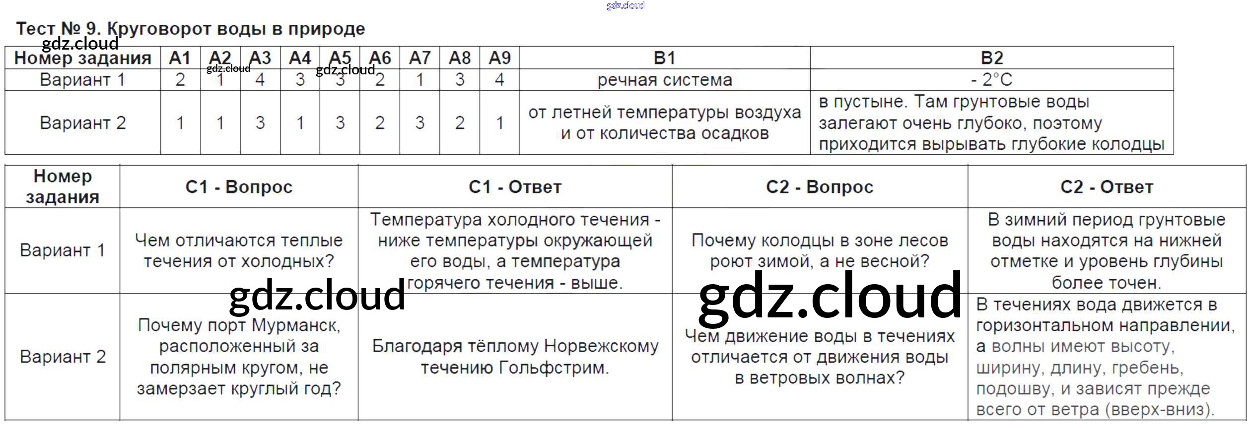 Ответ на задание Тест-9. Круговорот воды в природе Контрольно-измерительные материалы (КИМ) География за 6 (шестой) класс Жижина 2018
