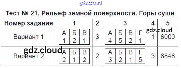 Ответ на задание Тест-21. Рельеф земной поверхности. Горы суши Тесты География за 6 (шестой) класс Пятунина, Пятунин УМК 2017 ФГОС онлайн и без номера телефона.