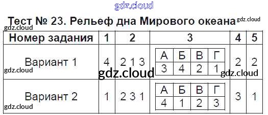 Ответ на задание Тест-23. Рельеф дна Мирового океана Тесты География за 6 (шестой) класс Пятунина, Пятунин УМК 2017 ФГОС онлайн и без номера телефона.
