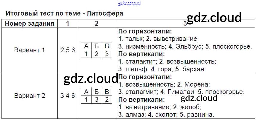 Ответ на задание Итоговый тест по теме - Литосфера Тесты География за 6 (шестой) класс Пятунина, Пятунин УМК 2017