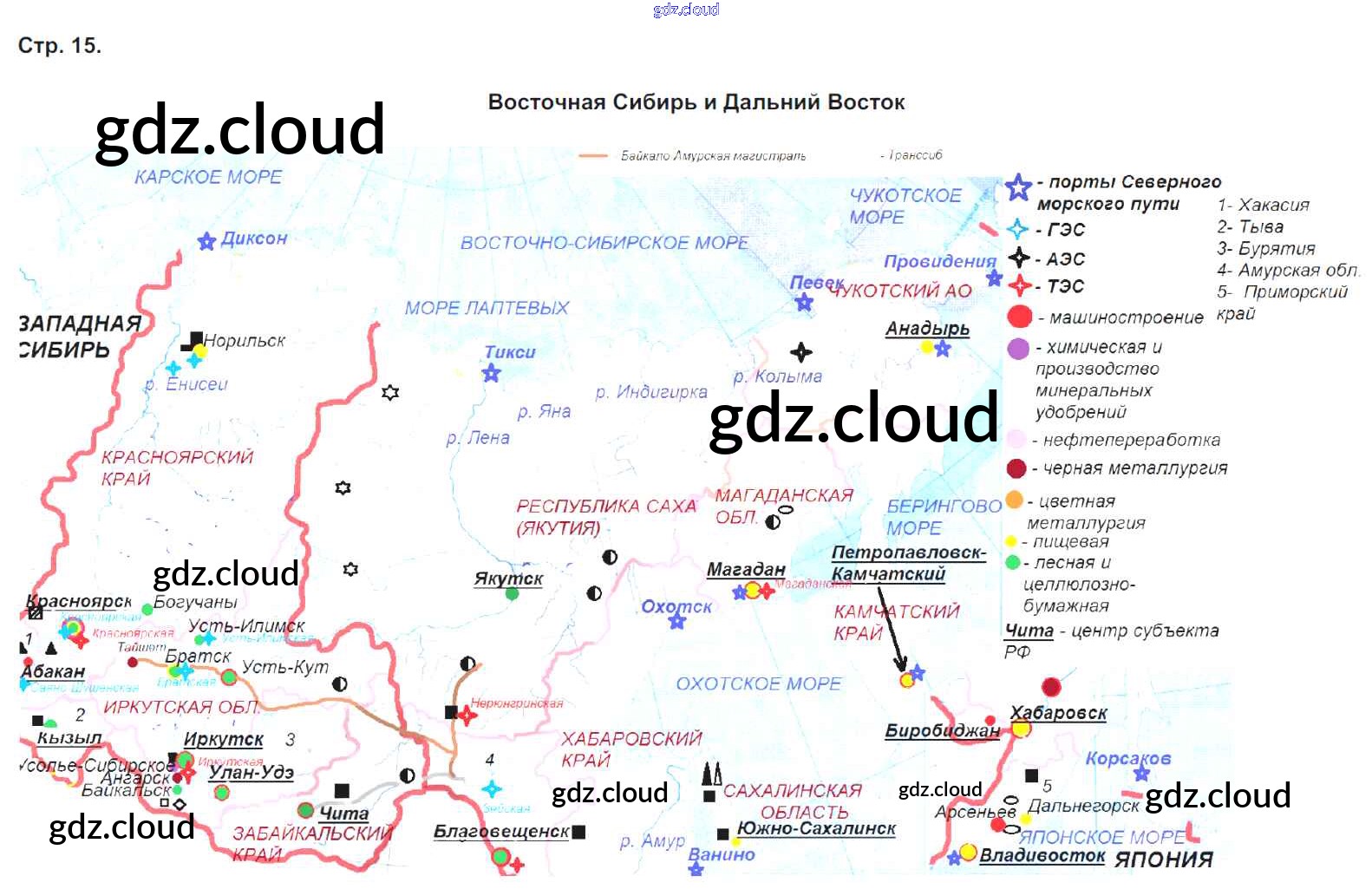 Ответ на задание стр.15. Восточная Сибирь и Дальний Восток-2 Контурные карты География за 9 (девятый) класс Приваловский 2020