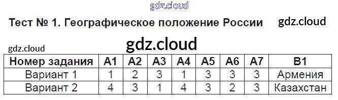 Ответ на задание Тест №1. Географическое положение России Контрольно-измерительные материалы (КИМ) География за 9 (девятый) класс Жижина 2017