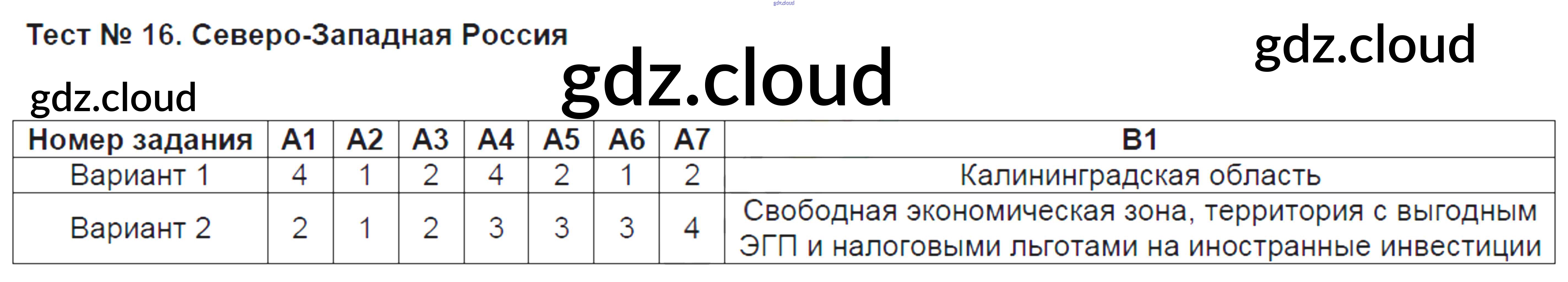 Ответ на задание Тест №16. Северо-Западная Россия Контрольно-измерительные материалы (КИМ) География за 9 (девятый) класс Жижина 2017