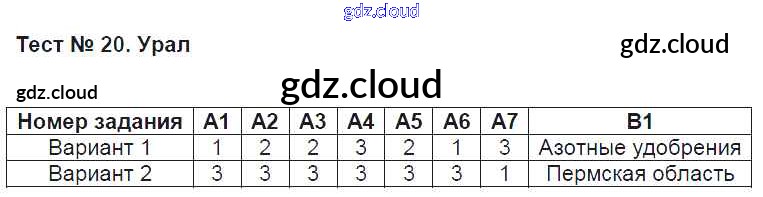 Ответ на задание Тест №20. Урал Контрольно-измерительные материалы (КИМ) География за 9 (девятый) класс Жижина 2017