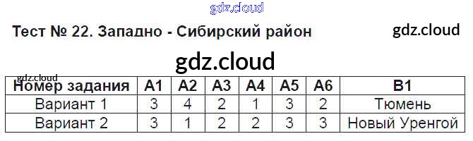 Ответ на задание Тест №22. Западно-Сибирский район Контрольно-измерительные материалы (КИМ) География за 9 (девятый) класс Жижина 2017