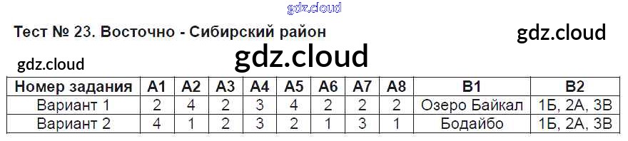 Ответ на задание Тест №23. Восточно-Сибирский район Контрольно-измерительные материалы (КИМ) География за 9 (девятый) класс Жижина 2017