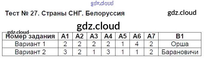 Ответ на задание Тест №27. Страны СНГ. Белоруссия Контрольно-измерительные материалы (КИМ) География за 9 (девятый) класс Жижина 2017