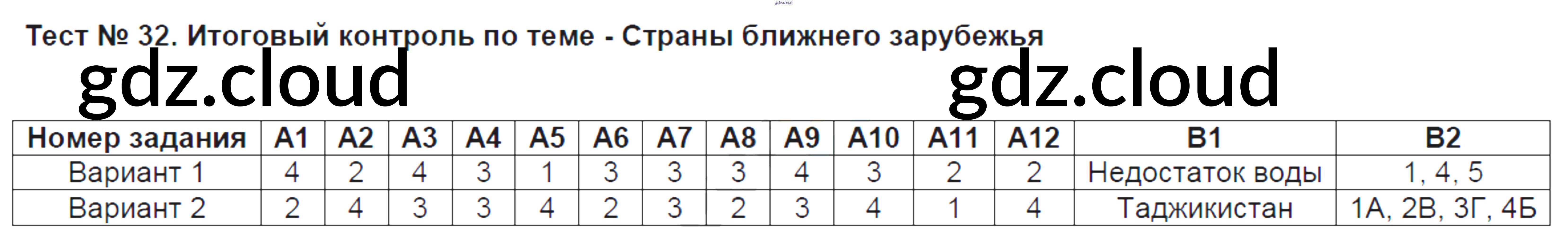 Ответ на задание Тест №32. Итоговый контроль по теме - Страны ближнего зарубежья Контрольно-измерительные материалы (КИМ) География за 9 (девятый) класс Жижина 2017