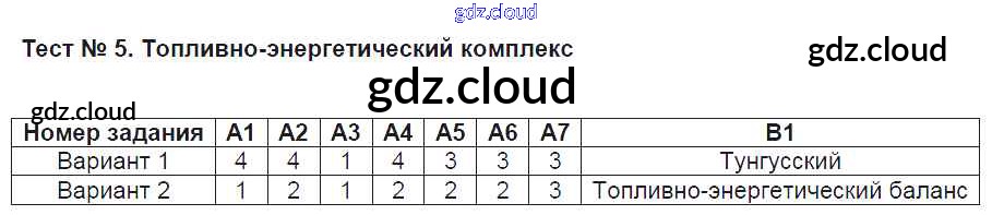 Ответ на задание Тест №5. Топливно-энергетический комплекс Контрольно-измерительные материалы (КИМ) География за 9 (девятый) класс Жижина 2017