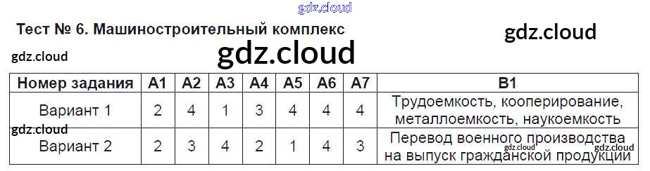 Ответ на задание Тест №6. Машиностроительный комплекс Контрольно-измерительные материалы (КИМ) География за 9 (девятый) класс Жижина 2017