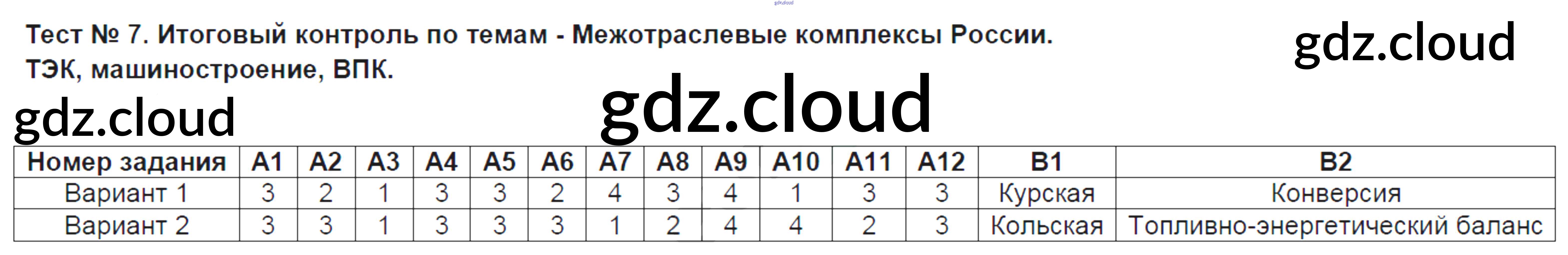 Ответ на задание Тест №7. Итоговый контроль по темам - Межотраслевые комплексы России Контрольно-измерительные материалы (КИМ) География за 9 (девятый) класс Жижина 2017