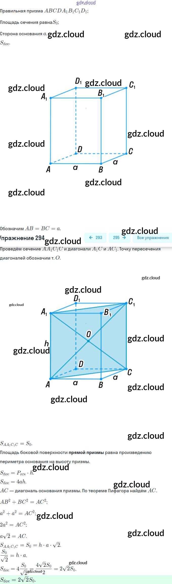 Ответ на задание 294 Учебник Геометрия  за 10, 11 (десятый, одиннадцатый) класс Атанасян, Бутузов, Кадомцев, Киселева, Позняк  Базовый и углубленный уровень 2015, 2023