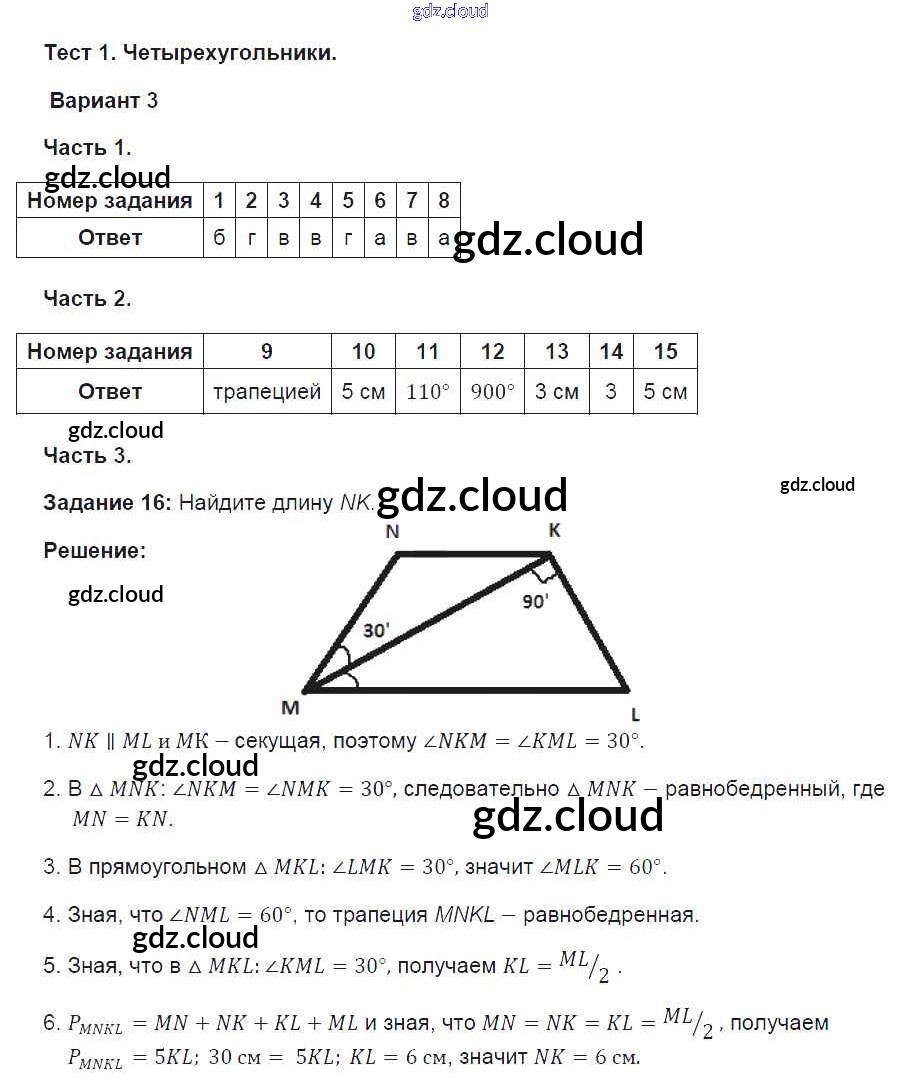 Ответ на задание вариант №3 Тесты Геометрия за 8 (восьмой) класс Фарков УМК 2014 ФГОС онлайн и без номера телефона.
