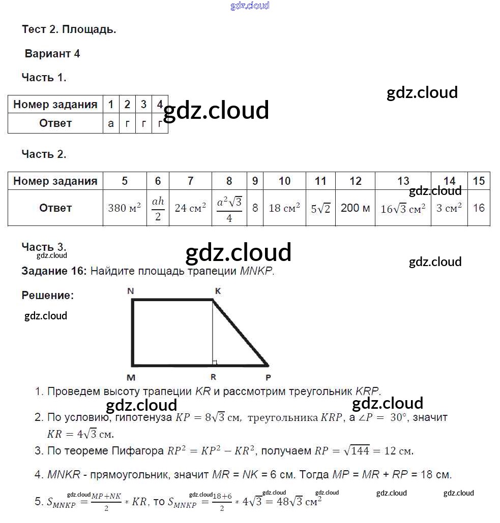 Ответ на задание вариант №4 Тесты Геометрия за 8 (восьмой) класс Фарков УМК 2014 ФГОС онлайн и без номера телефона.