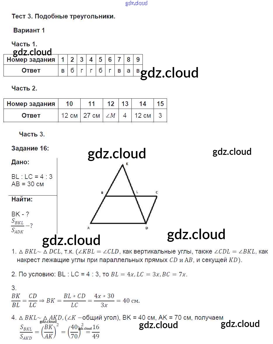Ответы к Главе 3. Подобные треугольники по Геометрии 8 класс Тесты Фарков УМК Экзамен