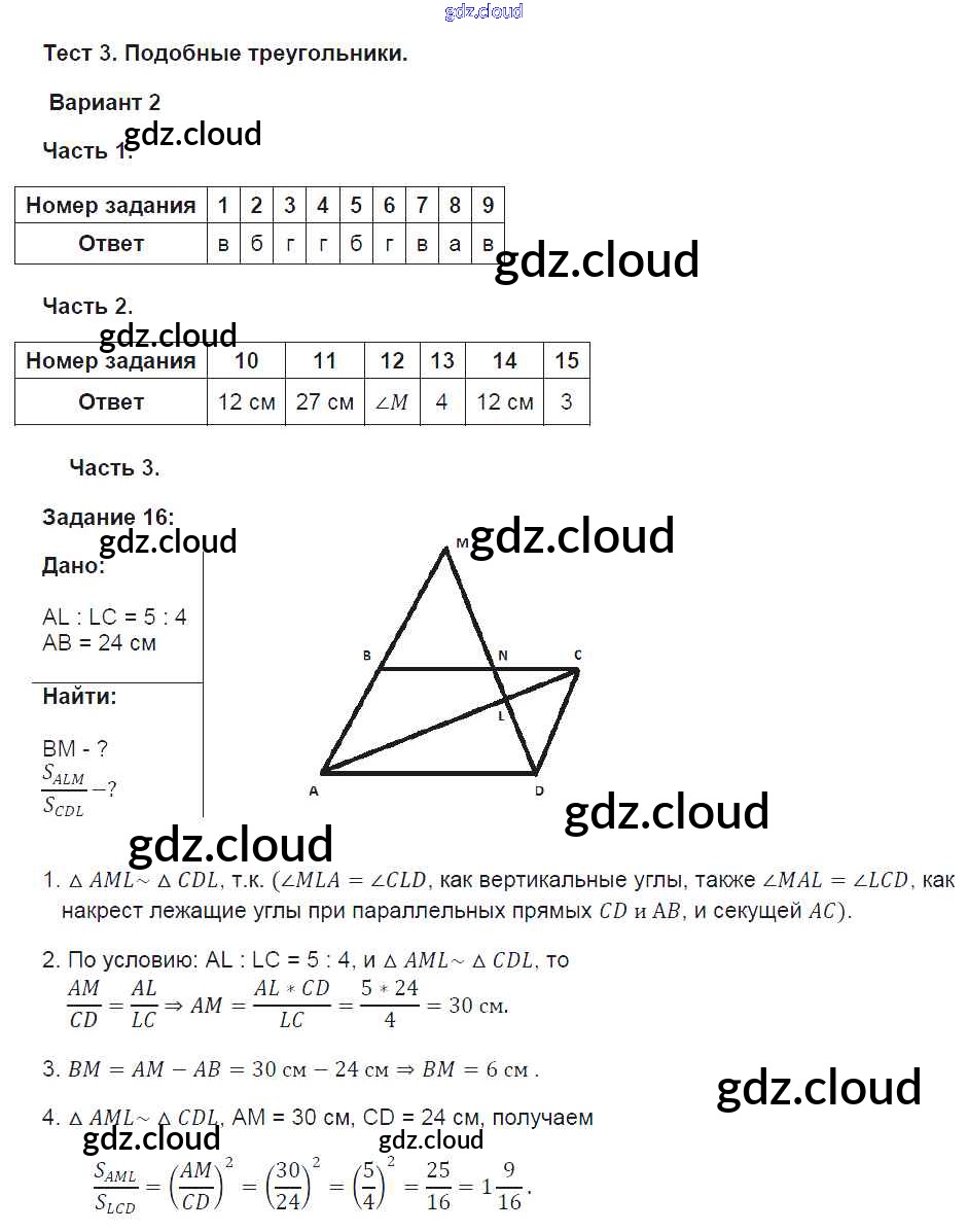 Ответы к Главе 3. Подобные треугольники по Геометрии 8 класс Тесты Фарков УМК Экзамен
