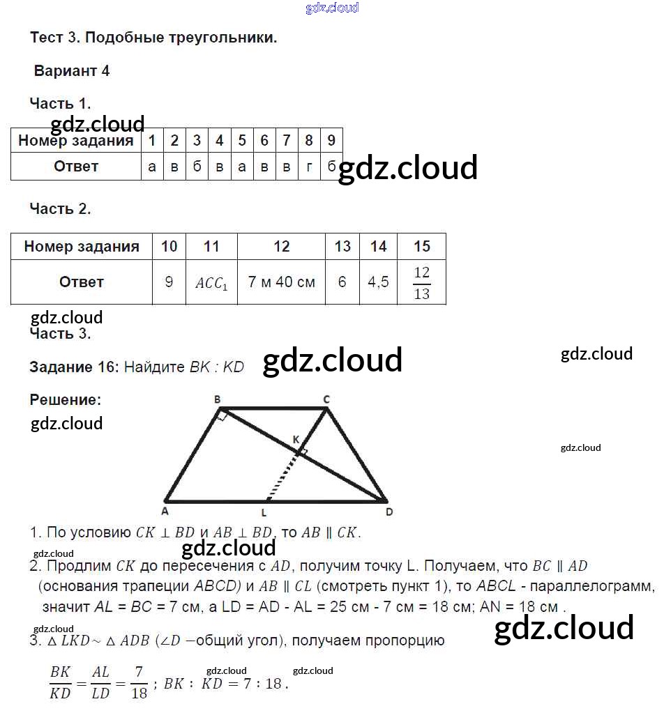 Ответы к Главе 3. Подобные треугольники по Геометрии 8 класс Тесты Фарков УМК Экзамен