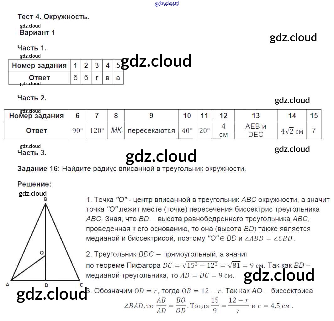 Ответы к Главе 4. Окружность по Геометрии 8 класс Тесты Фарков УМК Экзамен