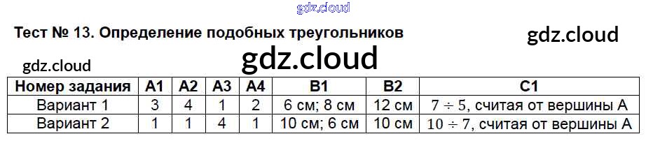 Ответ на задание Тест №13. Определение подобных треугольников Контрольно-измерительные материалы (КИМ) Геометрия за 8 (восьмой) класс Гаврилова 2018