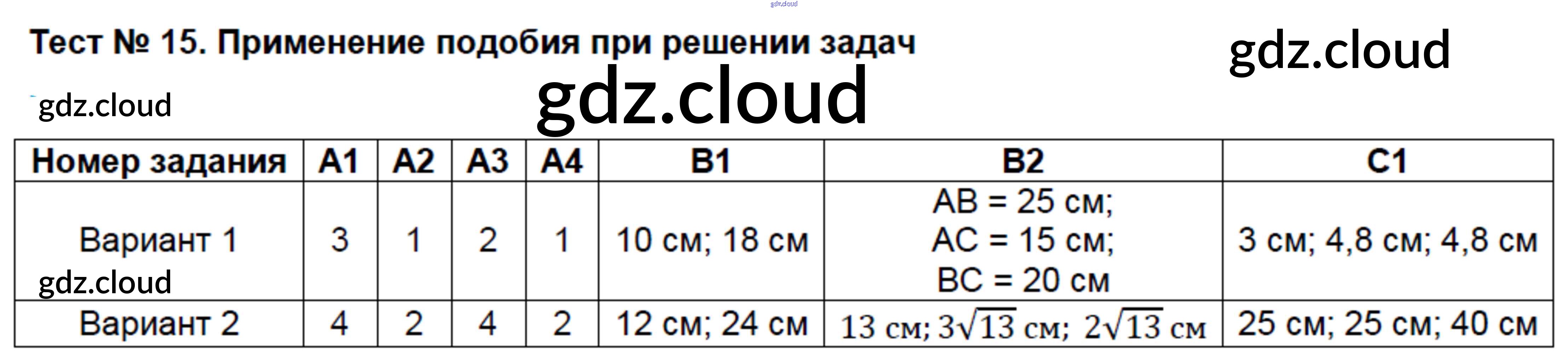 Ответ на задание Тест №15. Применение подобия при решении задач Контрольно-измерительные материалы (КИМ) Геометрия за 8 (восьмой) класс Гаврилова 2018