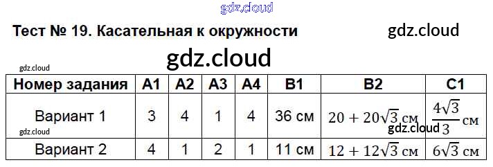 Ответ на задание Тест №19. Касательная к окружности Контрольно-измерительные материалы (КИМ) Геометрия за 8 (восьмой) класс Гаврилова 2018