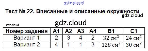 Ответ на задание Тест №22. Вписанные и описанные окружности Контрольно-измерительные материалы (КИМ) Геометрия за 8 (восьмой) класс Гаврилова 2018