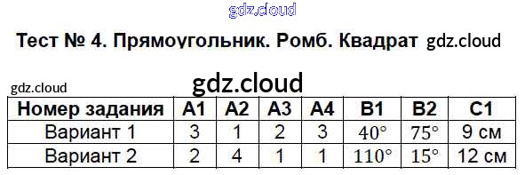 Ответ на задание Тест №4. Прямоугольник. Ромб. Квадрат Контрольно-измерительные материалы (КИМ) Геометрия за 8 (восьмой) класс Гаврилова 2018