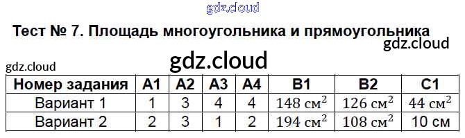 Ответ на задание Тест №7. Площадь многоугольника и прямоугольника Контрольно-измерительные материалы (КИМ) Геометрия за 8 (восьмой) класс Гаврилова 2018