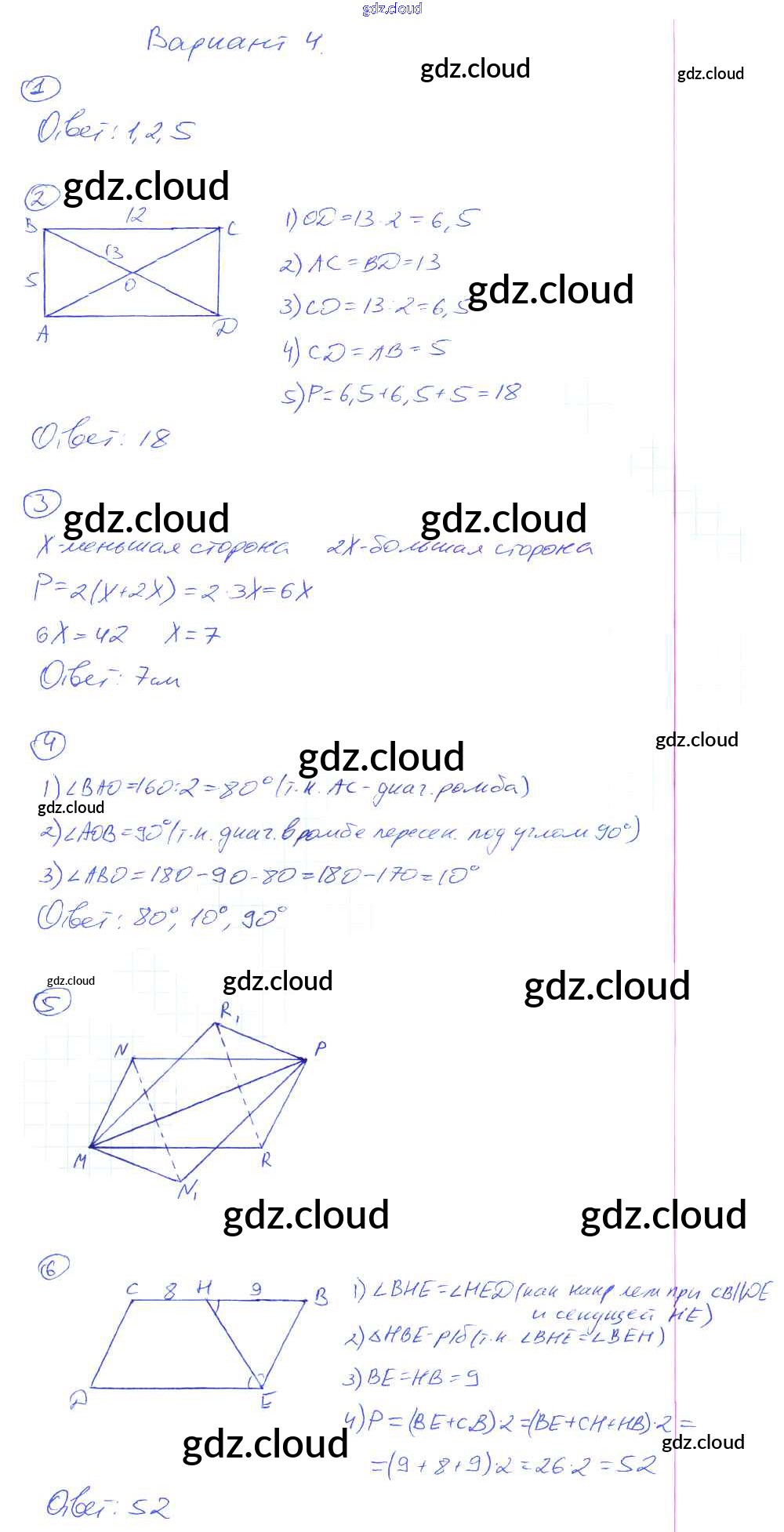 Ответы к КР-1. Четырехугольники по Геометрии 8 класс Контрольные работы Мельникова УМК Экзамен
