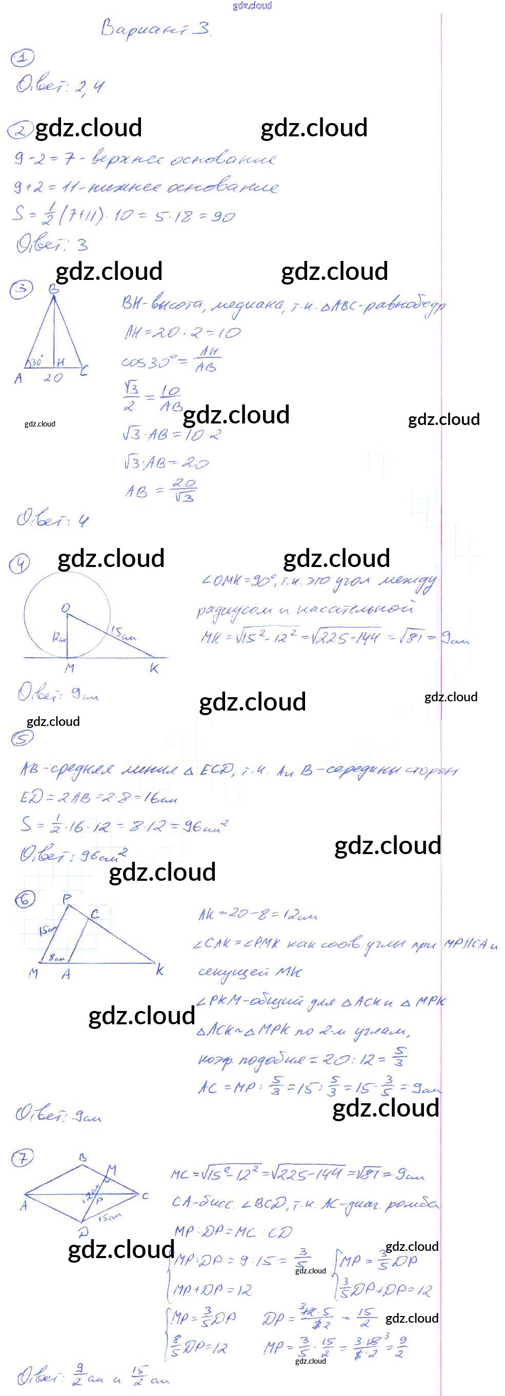 Ответ на задание Вариант №3 Контрольные работы Геометрия за 8 (восьмой) класс Мельникова УМК 2013