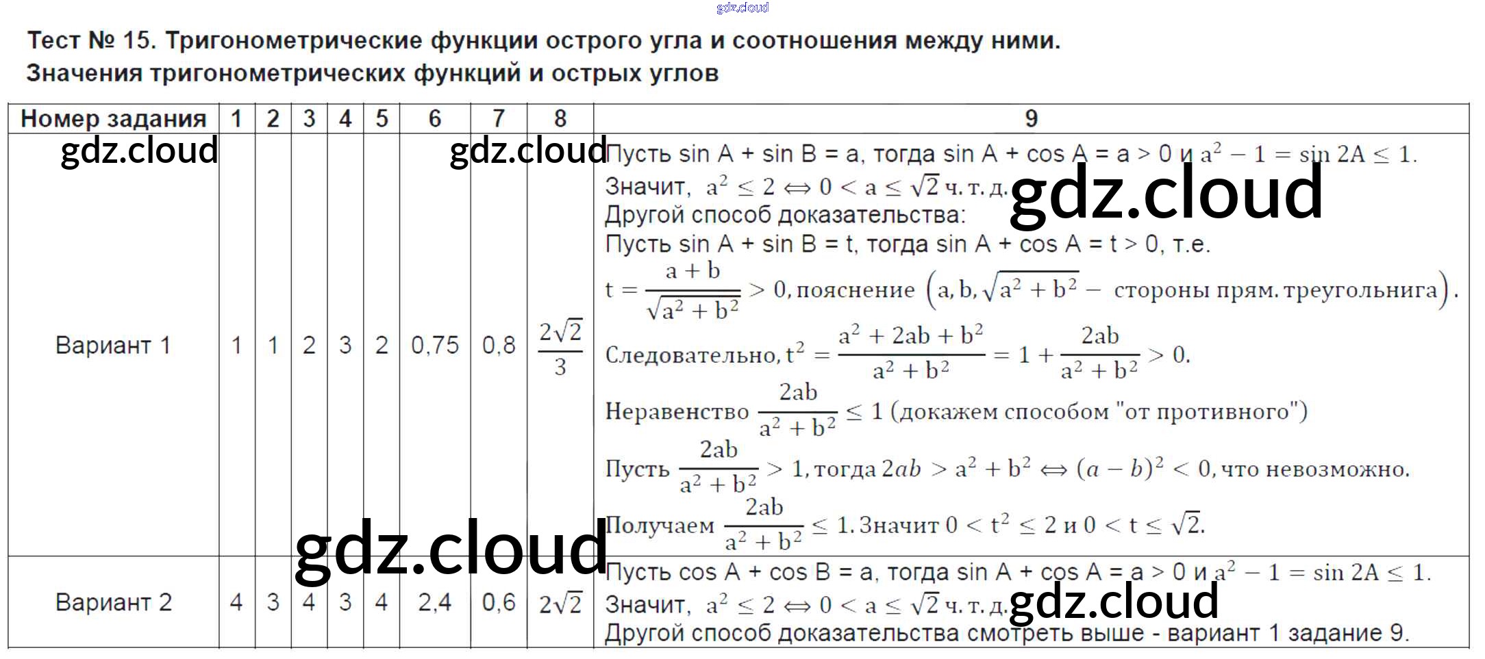 Ответ на задание Тест №15. Тригонометрические функции острого угла и соотношения между ними Контрольно-измерительные материалы (КИМ) Геометрия за 8 (восьмой) класс Рязановский, Мухин 2014